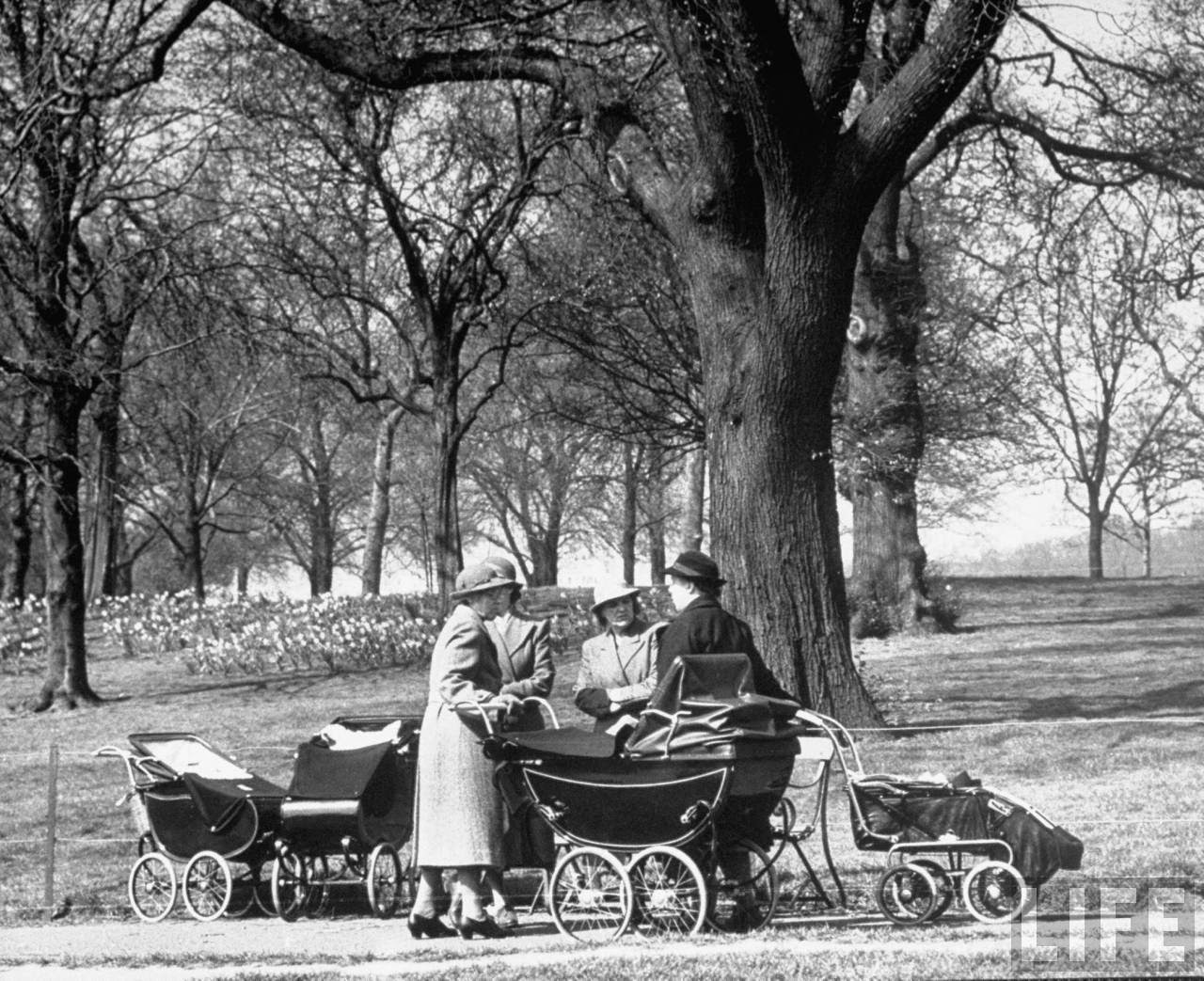 | Woman walking their babies carriages and gossiping in Hyde park. |