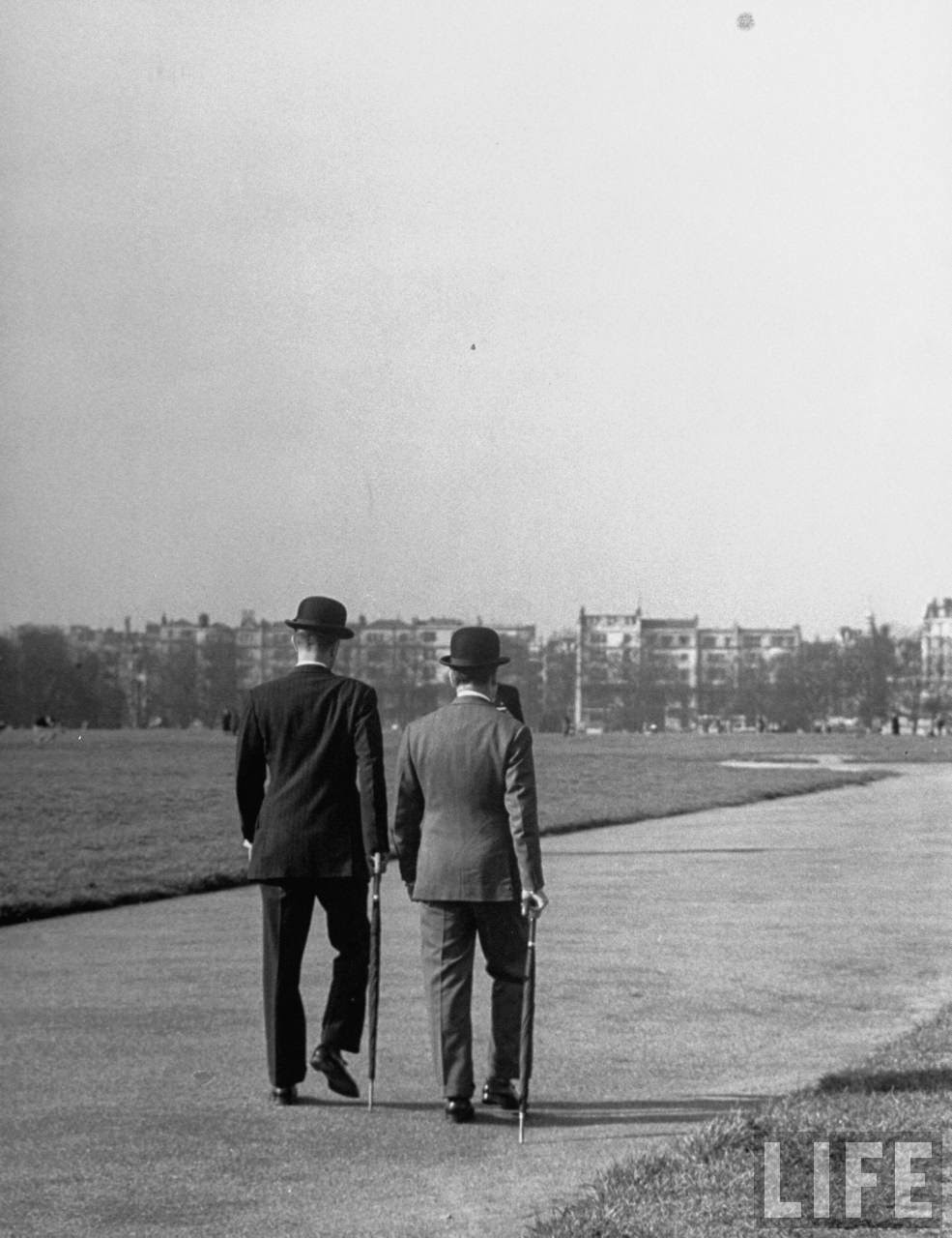 | Two Englishmen, walking side by side along wide path keeping perfect step withone another. |