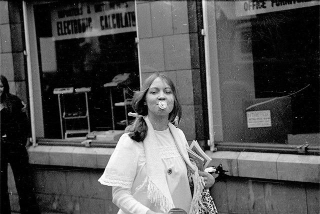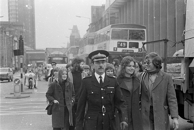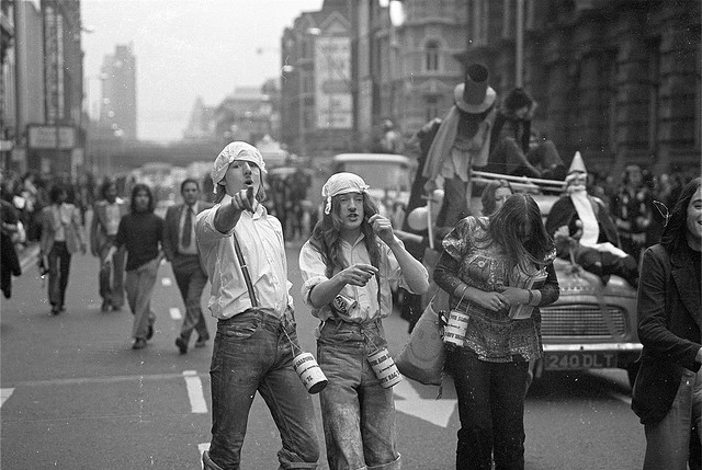 Here at the Manchester and Salford students' Rag day parade that was staged in 1974. The students of seventy four parading through the streets of the city accompanied by a very stern looking policeman. However, two of his colleagues, a monkey masked driver and a couple of Monty Python fans dressed as Gumbys add some fun to the parade.